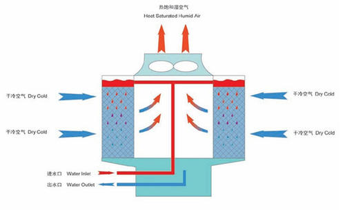 冷却塔的适用范围:工业生产或制冷过程中产生的废热通常由冷却水引导。冷却塔的作用是将带有废热的冷却水在塔内与空气进行热交换,将废热传递给空气,散发到大气中。例如,在火力发电厂,锅炉将水加热成高温高压蒸汽,促进汽轮机工作,使发电机发电。汽轮机工作后,废气排入冷凝器,与冷却水进行热交换,凝结成水,然后用水泵回到锅炉循环。在此过程中,蒸汽的废热传递给冷却水,使水温度升高,带有废热的冷却水传递给空气,从风筒排入大气环境。